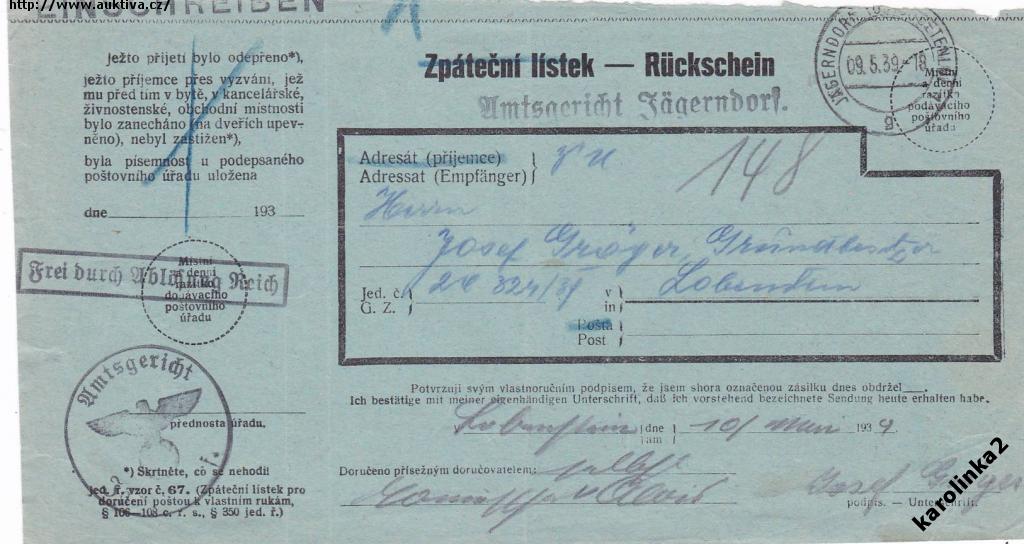 POŠTOVNA SUDETY=LOBENSTEIN=ÚVALNO=KRNOV/rok1939*c8277