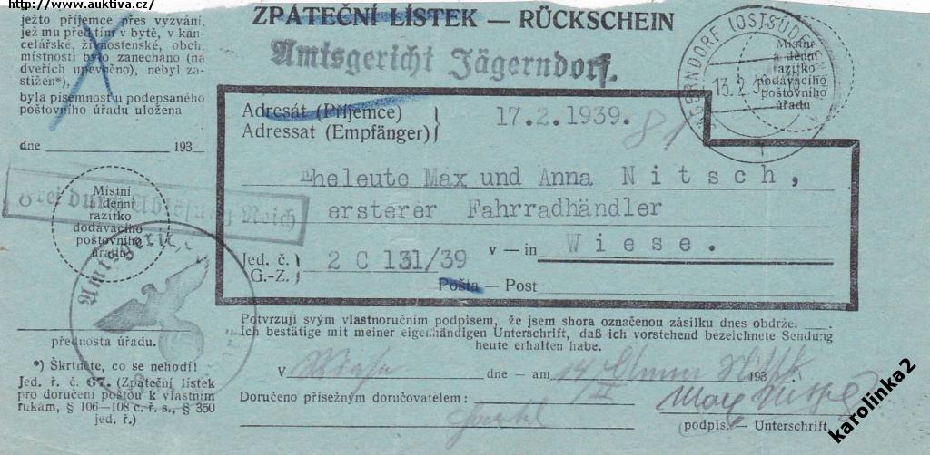 POŠTOVNA SUDETY=WIESE=VIŽŇOV=KRNOV/rok1939*c8269