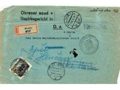 Přední část doporučeného dopisu ze soudu s doplatní známkou a příchozím raz.Velké Hoštice