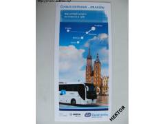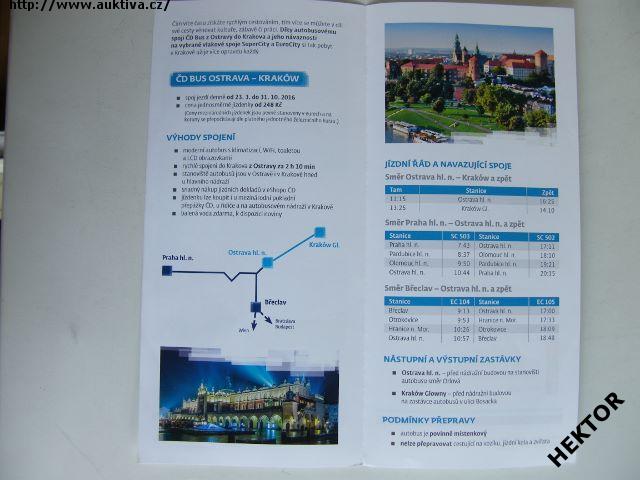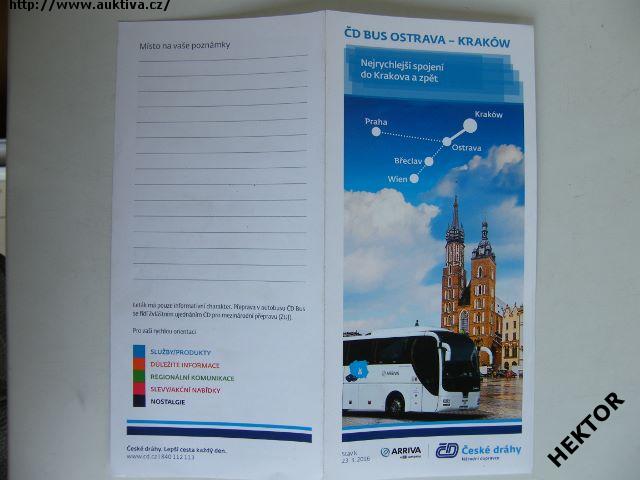 Prospekt skládací „ČD Bus Ostrava – Kraków“ – 2 listy – česky. Stav k 23. 3. 2016. Nový nepoužitý. Cena je za 1 kus.