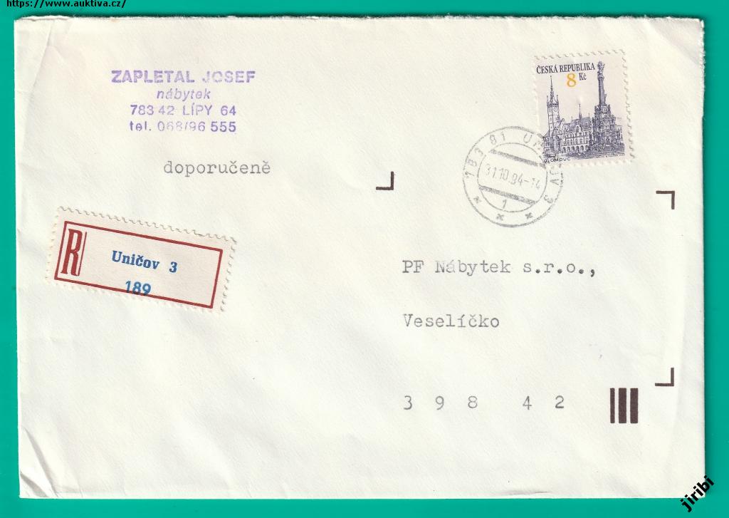 Doporučený dopis s klasickou červenou R nálepkou,  obálka nemusí být zobrazena celá, formát je ale zachován