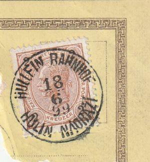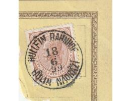 Rakousko 1899 František Josef I., Michel č.51 na výstřižku z pohlednice, raz. Hullein Bahnhof, Hulín nádraží