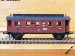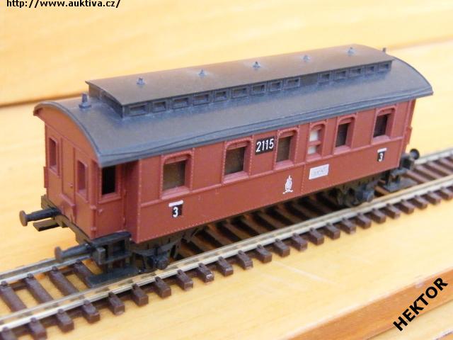 RARITA!!! Sběratelský model 2osého osobního vozu se zavřenými nástupními plošinami Old Timer typu Ci Pr 05, KPEV, 3. třída, epocha I, karosérie s 5 + 6 okny stříkaná hnědočervenou, logo KPEV tištěno bílou na hnědočerveném podkladu, číslo vozu 2115 tištěno bílou na černém obdélníčku mezi okny, popisy tištěny bílou na černém rámu, čísla třídy tištěna bílou na černém čtverečku, směrová cedule naznačena bílým obdélníčkem pod okny, střecha je součástí karosérie stříkaná černou, rámy oken nahoře kulaté, v oknech plochý plast, spodek vozu umělohmotný černý na západky bez plynové jímky, brzdová soustava součástí spodku vozu. Výrobcem Zeuke nebo BTTB v 70. letech, kat. č. 3121. Výměnná spřáhla a umělohmotná dvojkolí. Po zakoupení byl model odložen a pouze občas ježděn, je dlouho neježděn. Bez originální krabičky.