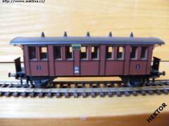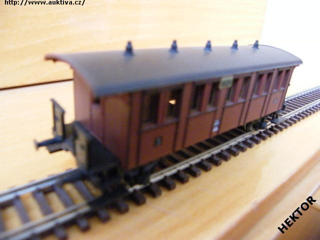 RARITA!!! Sběratelský model 2osého osobního vozu s otevřenými nástupními plošinami Old Timer typu Ci Pr 91a, KPEV, 3. třída, epocha I, karosérie s 10 + 10 okny stříkaná hnědočervenou a hrany obtažené černou, barevné logo KPEV tištěno na hnědočerveném podkladu, číslo vozu tištěno žlutou na černém obdélníčku mezi okny, popisy tištěny bílou na černém rámu, čísla třídy tištěna bílou na černém čtverečku, bez směrové cedule, střecha je součástí karosérie stříkaná černou, rámy oken nahoře hranaté, v oknech plochý plast s naznačenými hnědými rámy, jednoduché plastové zábradlí na plošině černé, spodek vozu umělohmotný černý na západky S PLYNOVOU JÍMKOU, brzdová soustava součástí spodku vozu. Výrobcem Zeuke TT Bahn od roku 1991, kat. č. 13116. Výměnná spřáhla (dodám) typu BTTB černá a KOVOVÁ DVOJKOLÍ LOUKOŤOVÁ. Po zakoupení byl model odložen do vitríny a neježděn, je dlouho neježděn. Bez originální krabičky.