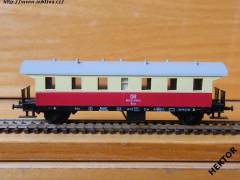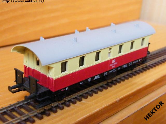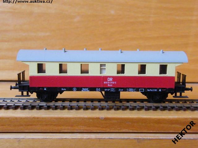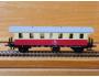 RARITA!!! Sběratelský model 2osého osobního vozu s otevřenými nástupními plošinami typu Baai (Bi - 30), DR, 2. třída, epocha IV, nová karosérie stříkaná v úrovni oken žlutokrémovou a pod okny tmavší červenou a rám barvený černou, logo DR tištěné bílou na tmavším červeném podkladu, BEZ ČÍSLA TŘÍDY, číslo vozu 50 50 24 - 26 152 - 9 tištěno bílou na tmavším červeném podkladu, popisy tištěny bílou na tmavším červeném podkladu a na černém rámu, bez směrové cedule, střecha je součástí karosérie stříkaná světlejší šedou, rámy oken nahoře hranaté, v oknech plochý plast, jednoduché umělohmotné zábradlí z vozů OLD TIMER na plošině černé, spodek vozu umělohmotný černý zaklapávací s naznačenou příhradovou konstrukcí s otvory pro doplňky, brzdová soustava součástí spodku vozu. Výrobcem BTTB v 80. letech, kat. č. 03215 (jako 03211). Výměnná spřáhla a umělohmotná dvojkolí. Po zakoupení byl model odložen do vitríny a neježděn, je dlouho neježděn. Bez originální krabičky.
