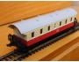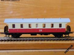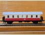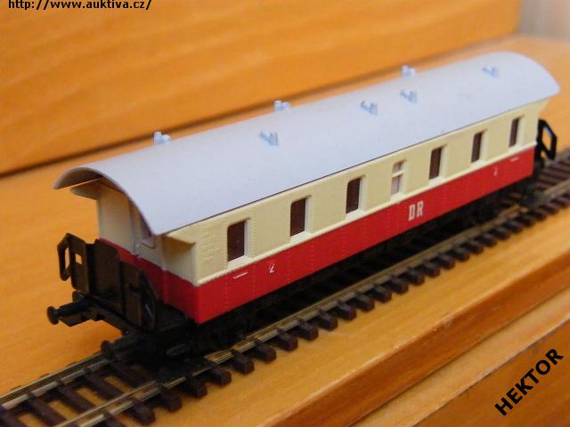 RARITA!!! Sběratelský model 2osého osobního vozu s otevřenými nástupními plošinami typu Bi - 30, DR, 2. třída, epocha III, karosérie stříkaná v úrovni oken žlutokrémovou a pod okny červenou a rám barvený černou, logo DR tištěné bílou na červeném podkladu, číslo třídy lisované obtažené bílou, číslo vozu a popisy lisované nahoře vlevo v úrovni oken neobtažené, bez směrové cedule, střecha je samostatný výlisek barvený ve hmotě světlejší šedou, rámy oken nahoře zakulacené, v oknech plochý plast, hrubé kovové zábradlí na plošině černé, spodek vozu umělohmotný černý zaklapávací, brzdová soustava vkládaná černá. Výrobcem Zeuke v 60. letech, kat. č. 159/70. Výměnná spřáhla a umělohmotná dvojkolí. Po zakoupení byl model odložen do vitríny a pouze občas ježděn, je dlouho neježděn. Bez originální krabičky.