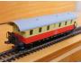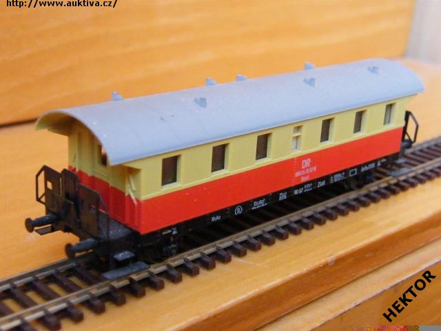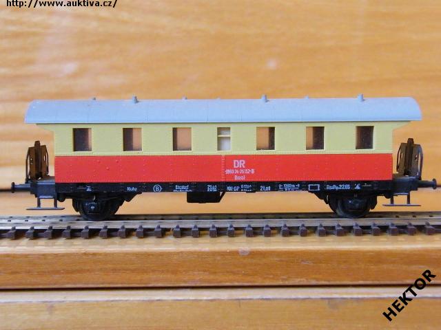 RARITA!!! Sběratelský model 2osého osobního vozu s otevřenými nástupními plošinami typu Baai (Bi - 30), DR, 2. třída, epocha IV, nová karosérie stříkaná v úrovni oken žlutokrémovou a pod okny světlou červenou a rám barvený černou, logo DR tištěné bílou na světlém červeném podkladu, BEZ ČÍSLA TŘÍDY, číslo vozu 50 50 24 - 26 152 - 9 tištěno bílou na světlém červeném podkladu, popisy tištěny bílou na světlém červeném podkladu a na černém rámu, bez směrové cedule, střecha je součástí karosérie stříkaná světlejší šedou, rámy oken nahoře hranaté, v oknech plochý plast, jemnější kovové zábradlí na plošině černé, spodek vozu umělohmotný černý zaklapávací s naznačenou příhradovou konstrukcí bez otvorů pro doplňky, brzdová soustava součástí spodku vozu. Výrobcem Zeuke koncem 60. let, kat. č. 545/712. Výměnná spřáhla a umělohmotná dvojkolí. Po zakoupení byl model ježděn, je dlouho neježděn. Bez originální krabičky.