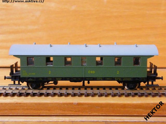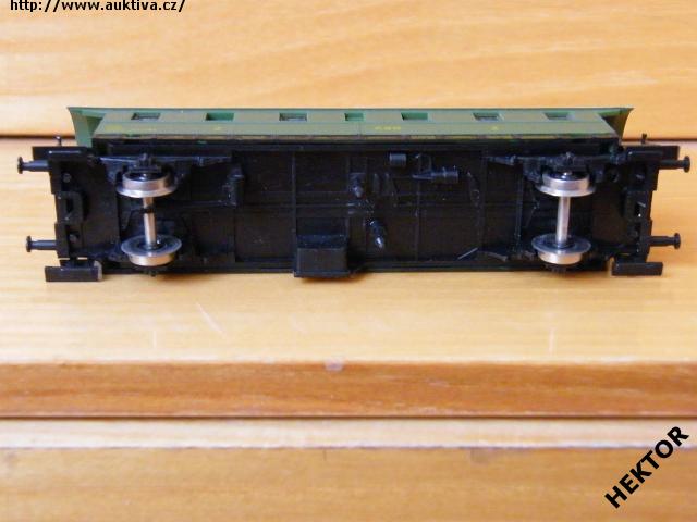 RARITA!!! Sběratelský model 2osého osobního vozu s otevřenými nástupními plošinami typu Bi - 30, ČSD, 2. třída, epocha III, nová karosérie stříkaná tmavší zelenou, logo ČSD tištěné nevýraznou žlutou na tmavším zeleném podkladu, číslo třídy tištěno nevýraznou žlutou na tmavším zeleném podkladu pod okny, číslo vozu Bi 4 - 7408 a popisy tištěny nevýraznou žlutou vlevo pod okny na tmavším zeleném podkladu a na černém rámu, bez směrové cedule, střecha je součástí karosérie stříkaná světlejší šedou, rámy oken nahoře hranaté, v oknech propracovaný plastový výlisek s hnědými rámi, !!!JEDNODUCHÉ UMĚLOHMOTNÉ ZÁBRADLÍ Z VOZŮ OLD TIMER!!! na plošině černé, spodek vozu umělohmotný černý zaklapávací s naznačenou příhradovou konstrukcí s dynamem a 2 rourami, brzdová soustava součástí spodku vozu. Výrobcem Zeuke TT Bahn od roku 1990 do roku 1991 v 1. výrobní sérii, kat. č. 13209. Výměnná spřáhla typu BTTB černá a kovová dvojkolí. Po zakoupení byl model odložen do vitríny a neježděn, je dlouho neježděn. Bez originální krabičky.