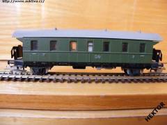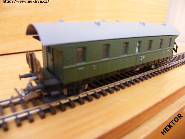 RARITA!!! Sběratelský model 2osého osobního vozu s otevřenými nástupními plošinami typu Bi - 30, DR, 2. třída, epocha III, karosérie stříkaná zelenou a rám barvený černou, logo DR lisováno obtaženo bélou, číslo třídy lisované obtažené bílou, číslo vozu a popisy lisované nahoře vlevo v úrovni oken neobtažené, bez směrové cedule, střecha je samostatný výlisek barvený ve hmotě světlejší šedou, rámy oken nahoře zakulacené, v oknech plochý plast, hrubé kovové zábradlí na plošině černé, spodek vozu umělohmotný černý zaklapávací, brzdová soustava vkládaná šedá. Výrobcem Zeuke v 60. letech, kat. č. 545/71. Průběžné spřáhlo Zeuke stříbrné a umělohmotná dvojkolí. Po zakoupení byl model odložen do vitríny a pouze občas ježděn, je dlouho neježděn. Bez originální krabičky.