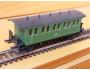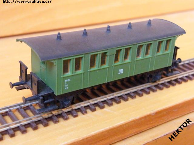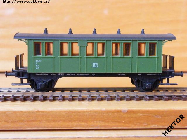 RARITA!!! Sběratelský model 2osého osobního vozu s otevřenými nástupními plošinami Old Timer typu Ci (ex Ci Pr 91a), DR, epocha III, bez označení třídy, karosérie s 10 + 10 okny stříkaná zelenou, logo DR tištěno bílou uprostřed pod okny na zeleném podkladu, číslo vozu 320 235 - krátké a popisy tištěny bílou vlevo pod okny na zeleném podkladu, popisy na černém rámu tištěny bílou, bez směrové cedule, střecha je součástí karosérie stříkaná černou, rámy oken nahoře hranaté, v oknech plochý plast s naznačenými hnědými rámy, jednoduché plastové zábradlí na plošině černé, spodek vozu umělohmotný černý na západky, brzdová soustava součástí spodku vozu. Výrobcem BTTB v 80. letech, kat. č. 03115. Výměnná spřáhla (dodám) typu BTTB černá a umělohmotná dvojkolí. Po zakoupení byl model odložen do vitríny a neježděn, je dlouho neježděn. V originální krabičce.