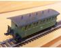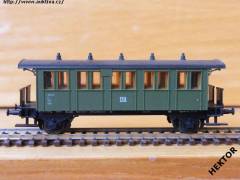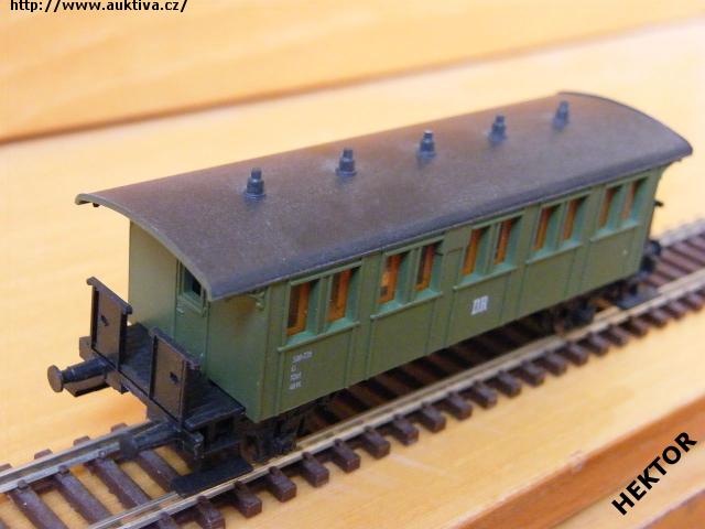 RARITA!!! Sběratelský model 2osého osobního vozu s otevřenými nástupními plošinami Old Timer typu Ci (ex Ci Pr 91a), DR, epocha III, bez označení třídy, karosérie s 10 + 10 okny stříkaná zelenou, logo DR tištěno bílou uprostřed pod okny na zeleném podkladu, číslo vozu 320 235 - krátké a popisy tištěny bílou vlevo pod okny na zeleném podkladu, popisy na černém rámu tištěny bílou, bez směrové cedule, střecha je součástí karosérie stříkaná černou, rámy oken nahoře hranaté, v oknech plochý plast s naznačenými hnědými rámy, jednoduché plastové zábradlí na plošině černé, spodek vozu umělohmotný černý na západky, brzdová soustava součástí spodku vozu. Výrobcem Tillig v 90. letech, kat. č. 13115. Výměnná spřáhla (dodám) typu BTTB černá a kovová dvojkolí černěná. Po zakoupení byl model odložen do vitríny a neježděn, je dlouho neježděn. Bez originální krabičky.