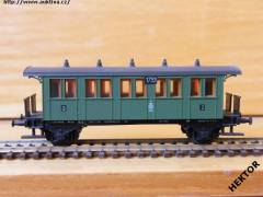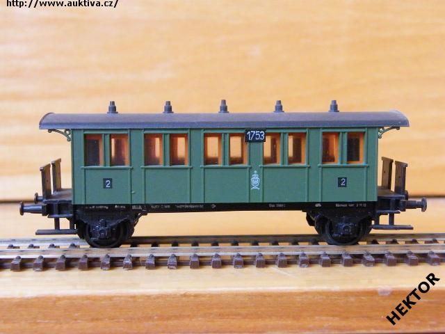 RARITA!!! Sběratelský model 2osého osobního vozu s otevřenými nástupními plošinami Old Timer typu Bi Pr 91a, KPEV, 2. třída, epocha I, karosérie s 10 + 10 okny stříkaná zelenou, logo KPEV tištěno bílou na zeleném podkladu, číslo vozu 1753 tištěno bílou na černém obdélníčku mezi okny, popisy tištěny bílou na černém rámu, čísla třídy tištěna bílou na černém čtverečku, bez směrové cedule, střecha je součástí karosérie stříkaná černou, rámy oken nahoře hranaté, v oknech plochý plast, jednoduché zábradlí umělohmotné černé, spodek vozu umělohmotný černý na západky bez plynové jímky, brzdová soustava součástí spodku vozu. Výrobcem BTTB v 80. letech, kat. č. 03114. Výměnná spřáhla typu BTTB černá a umělohmotná dvojkolí. Po zakoupení byl model odložen do vitríny a neježděn, je dlouho neježděn. V originální krabičce BTTB.