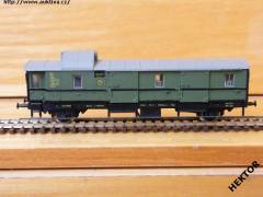 RARITA!!! Sběratelský model 2osého služebního vozu s jednou zavřenou nástupní plošinou typu Pwi - 30, DRG, epocha II, karosérie stříkaná tmavší zelenou a rám barvený černou, pod okny černá vodorovná linka, logo DRG tištěné žlutou na černém kroužku mezi okny na tmavším zeleném podkladu, číslo vozu 58 107 Berlin tištěno žlutou na černém podkladu mez okny, popisy tištěny žlutou vlevo v úrovni oken na tmavším zeleném podkladu a na černém rámu, bez směrové cedule, střecha se zasklenou nástavbou je součástí karosérie stříkaná šedou, kovové černé lávky po celé délce vozu, rámy oken nahoře hranaté, v oknech propracovaný plast, okna ve vstupních dveřích zasklená, spodek vozu umělohmotný černý s naznačenou příhradovou konstrukcí s otvory pro doplňky zaklapávací osazený rourou a dynamem, brzdová soustava součástí spodku vozu. Výrobcem BTTB koncem 80. let, kat. č. 13413. Výměnná spřáhla typu BTTB černá a kovová dvojkolí. Po zakoupení byl model odložen do vitríny a neježděn, je dlouho neježděn. Bez originální krabičky.