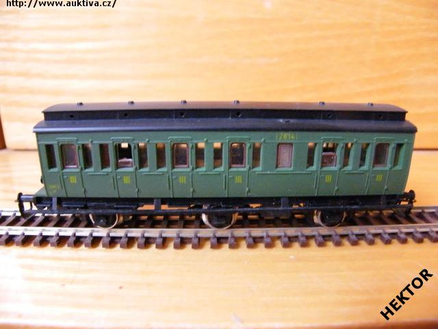 RARITA!!! Sběratelský model 3osého oddílového osobního vozu typu c6 TF bez brzdařské budky, SNCF, 3. třída, epocha III, karosérie stříkaná zelenou, logo SNCF tištěné žlutou dole vlevo pod okny na zeleném podkladu, čísla třídy tištěna římskými číslicemi žlutou na zeleném podkladu na dveřích jednotlivých oddílů, číslo vozu 2614 tištěno v rámečku žlutou na zeleném podkladu nad okny, bez popisů na rámu, bez směrové cedule, střecha je samostatný výlisek stříkaná černou, kovové černé lávky po celé délce vozu, rámy oken nahoře hranaté a ve dveřích kulaté, v oknech propracovaný plast s hnědými rámy, spodek vozu umělohmotný černý na západky osazený odpadní rourou a dynamem, brzdová soustava součástí spodku vozu. Výrobcem BTTB nebo Zeuke TT Bahn v letech 1988 - 91, kat. č. 13139. Spřáhla uložená v domečku na spodku vozu typu BTTB s kuličkou černá a kovová dvojkolí, prostřední dvojkolí pohyblivé do stran. Po zakoupení byl model odložen do vitríny a neježděn, je dlouho neježděn. Bez originální krabičky.