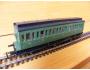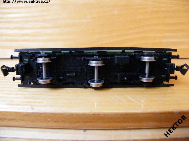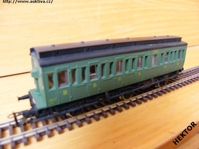 RARITA!!! Sběratelský model 3osého oddílového osobního vozu typu c6 TF bez brzdařské budky, SNCF, 3. třída, epocha III, karosérie stříkaná zelenou, logo SNCF tištěné žlutou dole vlevo pod okny na zeleném podkladu, čísla třídy tištěna římskými číslicemi žlutou na zeleném podkladu na dveřích jednotlivých oddílů, číslo vozu 2614 tištěno v rámečku žlutou na zeleném podkladu nad okny, bez popisů na rámu, bez směrové cedule, střecha je samostatný výlisek stříkaná černou, kovové černé lávky po celé délce vozu, rámy oken nahoře hranaté a ve dveřích kulaté, v oknech propracovaný plast s hnědými rámy, spodek vozu umělohmotný černý na západky osazený odpadní rourou a dynamem, brzdová soustava součástí spodku vozu. Výrobcem BTTB nebo Zeuke TT Bahn v letech 1988 - 91, kat. č. 13139. Spřáhla uložená v domečku na spodku vozu typu BTTB s kuličkou černá a kovová dvojkolí, prostřední dvojkolí pohyblivé do stran. Po zakoupení byl model odložen do vitríny a neježděn, je dlouho neježděn. Bez originální krabičky.