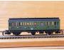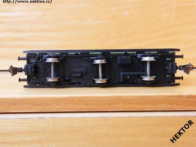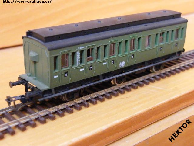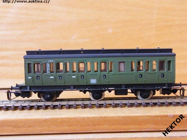 RARITA! Sběratelský model 3osého oddílového osobního vozu typu C3 Pr 07 bez brzdařské budky, DB, 2. třída, epocha III, karosérie stříkaná zelenou, logo DB s rámečkem tištěné bílou uprostřed pod okny na zeleném podkladu, čísla třídy tištěna bílou na černém čtverečku na dveřích oddílů, !!!číslo vozu 71 369 Mst!!! a popisy tištěny bílou vlevo mezi okny na zeleném podkladu, bez směrové cedule, střecha je samostatný výlisek stříkaná černou, kovové černé lávky po celé délce vozu, rámy oken nahoře hranaté a ve dveřích kulaté, v oknech propracovaný plast s hnědými rámy, spodek vozu umělohmotný černý na západky osazený odpadní rourou a dynamem, brzdová soustava součástí spodku vozu. Výrobcem BTTB koncem 80. let, kat. č. 13134. Spřáhla uložená v domečku na spodku vozu typu BTTB s kuličkou černá a kovová dvojkolí. Po zakoupení byl model odložen do vitríny a neježděn, je dlouho neježděn. Bez originální krabičky.