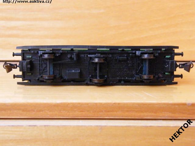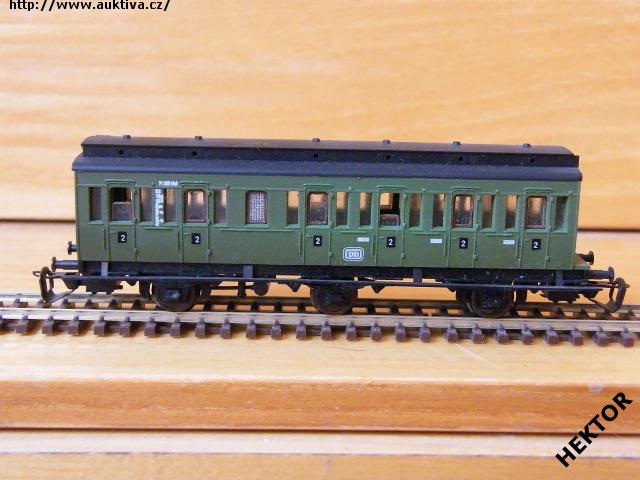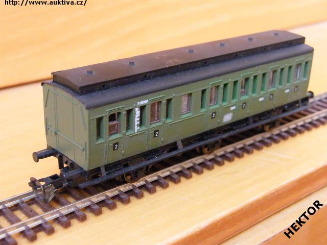 RARITA! Sběratelský model 3osého oddílového osobního vozu typu C3 Pr 07 bez brzdařské budky, DB, 2. třída, epocha III, karosérie stříkaná zelenou, logo DB s rámečkem tištěné bílou uprostřed pod okny na zeleném podkladu, čísla třídy tištěna bílou na černém čtverečku na dveřích oddílů, !!!číslo vozu 71 369 Mst!!! a popisy tištěny bílou vlevo mezi okny na zeleném podkladu, bez směrové cedule, střecha je samostatný výlisek stříkaná černou, kovové černé lávky po celé délce vozu, rámy oken nahoře hranaté a ve dveřích kulaté, v oknech propracovaný plast s hnědými rámy, spodek vozu umělohmotný černý na západky osazený odpadní rourou a dynamem, brzdová soustava součástí spodku vozu. Výrobcem Tillig v 90. letech, kat. č. 13134. Spřáhla uložená v domečku na spodku vozu typu BTTB s kuličkou černá a kovová dvojkolí černěná. Po zakoupení byl model odložen do vitríny a neježděn, je dlouho neježděn. Bez originální krabičky.