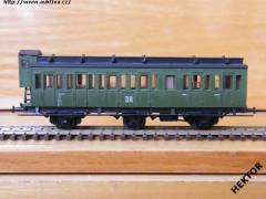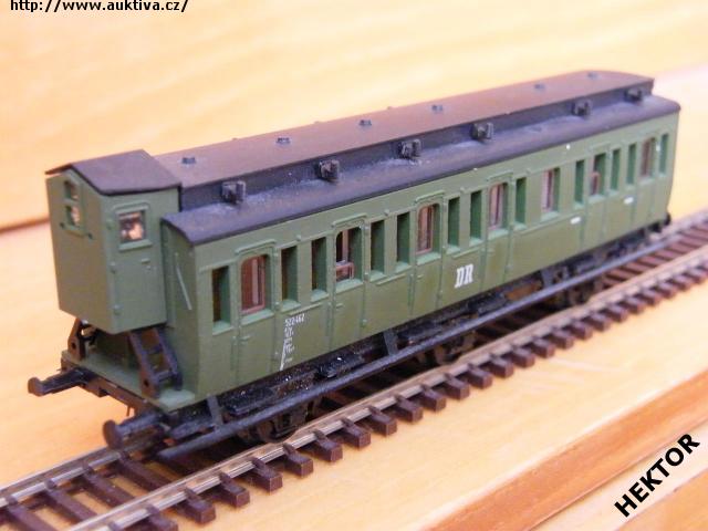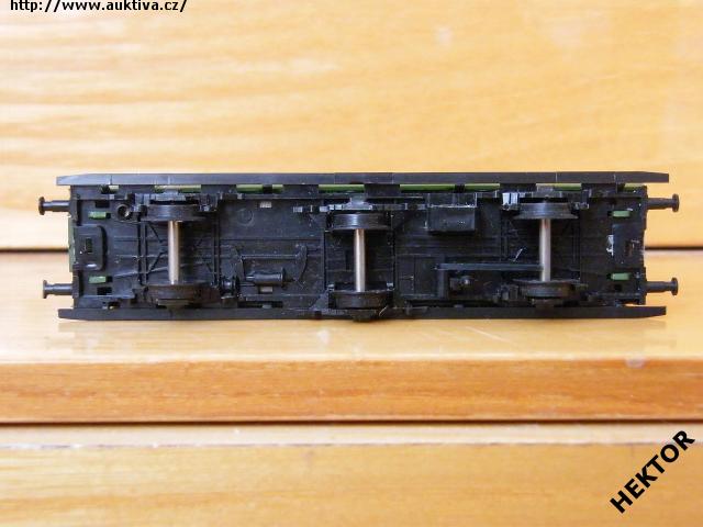 RARITA!!! Sběratelský model 3osého oddílového osobního vozu typu C3 Pr 07 s brzdařskou budkou, DR, 3. třída, epocha III, karosérie stříkaná zelenou, logo DR tištěné bílou uprostřed pod okny na zeleném podkladu, bez čísla třídy, číslo vozu 522 - 462 a popisy tištěny bílou vlevo pod okny na zeleném podkladu, bez směrové cedule, střecha je samostatný výlisek stříkaná černou, kovové černé lávky po celé délce vozu, rámy oken nahoře hranaté a ve dveřích kulaté, v oknech propracovaný plast s hnědými rámy, spodek vozu umělohmotný černý na západky osazený odpadní rourou a dynamem, brzdová soustava součástí spodku vozu. Výrobcem BTTB v 80. letech, kat. č. 03131. Výměnná spřáhla typu BTTB černá a umělohmotná dvojkolí, prostřední dvojkolí pohyblivé do stran. Po zakoupení byl model odložen do vitríny a neježděn, je dlouho neježděn. Bez originální krabičky.