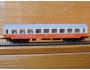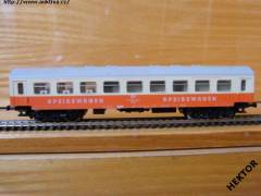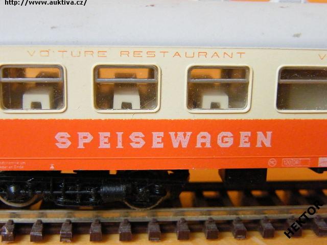 RARITA!!! Sběratelský model 4osého bufetového vozu typu REKO provedení WRge, DR, SPEISEWAGEN, epocha IV, karosérie stříkaná v úrovni oken krémovou a pod okny oranžovou i na rámu, čela celá stříkaná oranžovou, logo DR tištěné bílou uprostřed pod okny na oranžovém podkladu, číslo vozu 57 50 89 - 45 024 - 9 a popisy tištěny bílou na oranžovém podkladu i na rámu, pod okny tištěny bílou 2 větší nápisy SPEISEWAGEN na oranžovém podkladu, nad okny tištěny oranžovou nápisy na krímovém podkladu, bez směrové cedule, střecha hladká s ventilacemi stříkaná světlejší šedou, rámy oken v rozích kulaté, v oknech umělohmotný propracovaný výlisek se zvýrazněnou horní vyklápěcí částí stříbrnou, spodek vozu umělohmotný černý zaklapávací, 2osé podvozky umělohmotné černé, brzdová soustava součástí podvozku. NÁSTAVCE NA STOLEČCÍCH S OTVORY. Výrobcem BTTB koncem 80. let, kat. č. 13751. Výměnná spřáhla typu BTTB černá a kovová dvojkolí pro odběr proudu pro osvětlení vozu. Po zakoupení byl model odložen do vitríny a neježděn, je dlouho neježděn. V originální krabičce.