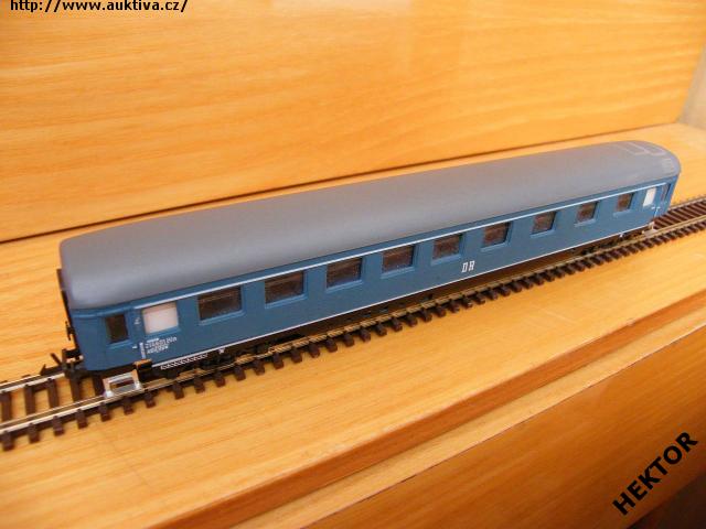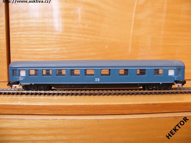 RARITA!!! Sběratelský model 4osého starého rychlíkového vozu typu AB 4 űpe, DR, 1. a 2. třída, epocha III, karosérie barvená modrou a na rámu černou, nad a u rámu bílý pruh, logo DR tištěné bílou uprostřed pod okny na modrém podkladu, číslo vozu a popisy lisované vlevo pod okny obtažené bílou a na rámu tištěné bílou na černém podkladu, čísla třídy lisovaná u dveří a obtažena bílou, bez směrové cedule, střecha stříkaná tmavší šedou, v oknech lisovaný plast, spodek vozu umělohmotný černý, 2osé podvozky kovové s lepenými černými maskami, bez brzdové soustavy. Výrobcem Zeuke v 60. let, kat. č. 545/79 nebo 545/792 nebo 545/79/2. Pevná spřáhla na podvozku typu Zeuke černá a umělohmotná dvojkolí. Po zakoupení byl model občas ježděn, je dlouho neježděn. Bez originální krabičky.
