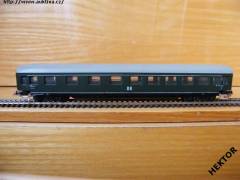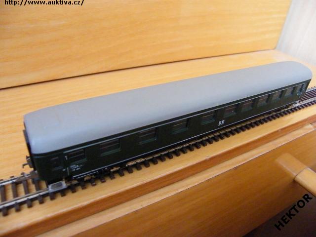 RARITA!!! Sběratelský model 4osého starého rychlíkového vozu typu AB 4 űpe, DR, 1. a 2. třída, epocha III, karosérie barvená tmavou zelenou a na rámu černou, nad a u rámu bílý pruh, logo DR tištěné bílou uprostřed pod okny na tmavém zeleném podkladu, číslo vozu a popisy lisované vlevo pod okny obtažené bílou a na rámu tištěné bílou na černém podkladu, čísla třídy lisovaná u dveří a obtažena bílou, bez směrové cedule, střecha stříkaná světlejší šedou, v oknech lisovaný plast, spodek vozu umělohmotný černý, 2osé podvozky kovové s lepenými černými maskami, bez brzdové soustavy. Výrobcem Zeuke v 60. letech, kat. č. 545/79 nebo 545/79/1 nebo 545/791. Pevná spřáhla na podvozku typu Zeuke stříbrná a umělohmotná dvojkolí. Po zakoupení byl model ježděn, je dlouho neježděn. V originální krabičce.