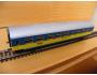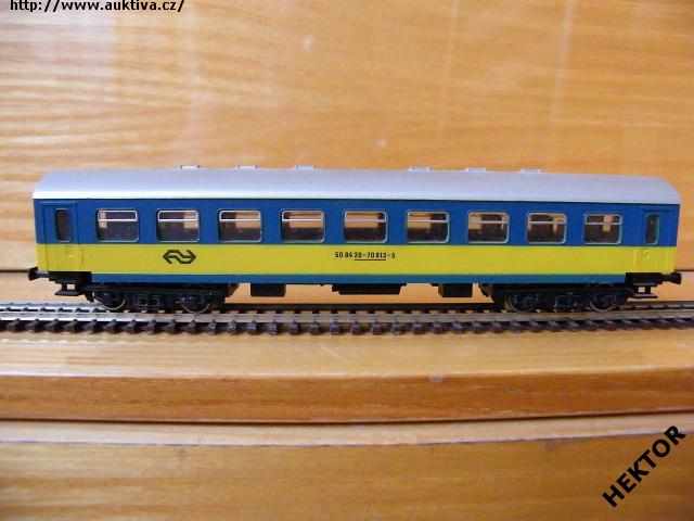 RARITA!!! Sběratelský model 4osého osobního vozu typu REKO, S VNITŘNÍM VYBAVENÍM, NS, bez označení třídy, karosérie stříkaná v úrovni oken modrou a pod okny žlutou barvenou ve hmotě a rám stříkaný modrou, čela celá žlutá barvená ve hmotě, logo NS tištěné černou vlevo pod okny na žlutém podkladu, bez čísla třídy, číslo vozu 50 84 20 - 70 813 - 5 tištěné černou na žlutém podkladu, bez popisů i na rámu, bez směrové cedule, střecha hladká s ventilacemi stříkaná stříbrnou, rámy oken v rozích kulaté, v oknech umělohmotný propracovaný výlisek se zvýrazněnou horní vyklápěcí částí stříbrnou, spodek vozu umělohmotný černý zaklapávací, 2osé podvozky umělohmotné černé, brzdová soustava součástí podvozku. Výrobcem BTTB pouze v roce 1984, kat. č. 13625. Výměnná spřáhla typu BTTB černá a kovová dvojkolí pro odběr proudu pro osvětlení vozu. Po zakoupení byl model odložen do vitríny a neježděn, je dlouho neježděn. Bez originální krabičky.