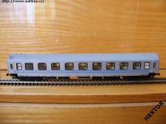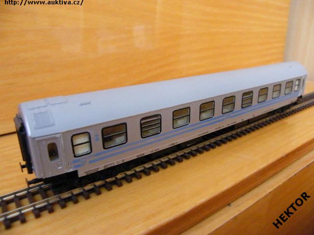 RARITA!!! Sběratelský model 4osého rychlíkového vozu typu Y provedení Bme, DR, 2. třída, epocha III, karosérie stříkaná stříbrnou i na rámu, čela stříkaná celá stříbrnou, pod okny dva širší modré pruhy mezi dveřmi, logo DR tištěné modrou uprostřed pod okny na stříbrném podkladu, číslo vozu a popisy tištěny modrou vlevo pod okny na stříbrném podkladu a na rámu popisy tištěny černou na stříbrném podkladu, čísla třídy tištěna modrou mezi okny na stříbrném podkladu, bez směrové cedule, střecha stříkaná světlou šedou, v oknech propracovaný plastový výlisek a rámy obtažené černou, spodek vozu umělohmotný černý zaklapávací, 2osé podvozky umělohmotné černé, brzdová soustava součástí podvozku. Výrobcem Tillig v 90. letech, kat. č. 13612. Výměnná spřáhla typu BTTB černá a kovová dvojkolí černěná pro odběr proudu pro osvětlení. Po zakoupení byl model odložen do vitríny a neježděn, je dlouho neježděn. Bez originální krabičky.