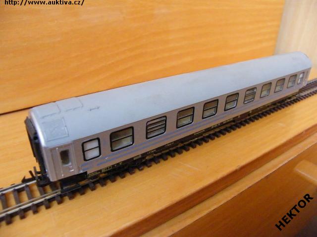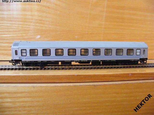 RARITA!!! Sběratelský model 4osého rychlíkového vozu typu Y provedení Bme, DR, 2. třída, epocha III, karosérie stříkaná stříbrnou a na rámu černou, čela stříkaná celá stříbrnou, pod okny dva širší modré nevýrazné pruhy mezi dveřmi, logo DR tištěné nevýraznou modrou uprostřed pod okny na stříbrném podkladu, číslo vozu a popisy tištěny nevýraznou modrou vlevo pod okny na stříbrném podkladu a na rámu popisy tištěny ŽLUTOU na černém podkladu, čísla třídy tištěna nevýraznou modrou mezi okny na stříbrném podkladu, bez směrové cedule, střecha stříkaná světlou šedou, v oknech propracovaný plastový výlisek a rámy obtažené černou, spodek vozu umělohmotný černý zaklapávací, 2osé podvozky kovové s lepenými černými maskami, brzdová soustava vkládaná černá. Výrobcem Zeuke koncem 60. a počátkem 70. let, kat. č. 545/84. Pevná spřáhla typu Zeuke černá a umělohmotná - kovová dvojkolí pro odběr proudu pro osvětlení. Po zakoupení byl model odložen do vitríny a pouze občas ježděn, je dlouho neježděn. Bez originální krabičky. Chybí jedna západka spřáhla a vzduchová jimka.