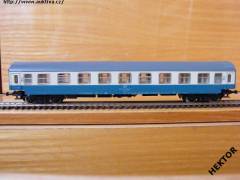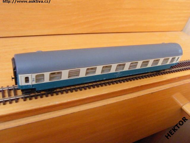 RARITA!!! Sběratelský model 4osého rychlíkového vozu typu Y provedení Bum 234, DB, 2. třída, epocha IV, karosérie stříkaná v úrovni oken krémovou a pod okny mořskou modrou i na rámu, dole je jedna bílá úzká linka oddělující karosérii od rámu, !!!ČELA CELÁ STŘÍKANÁ MOŘSKOU MODROU!!!, logo DB tištěné bílou v rámečku na podkladu mořské modré uprostřed pod okny, číslo vozu a popisy tištěny bílou na podkladu mořské modré i na rámu, čísla třídy tištěna mořskou modrou u vstupních dveří v úrovni oken, bez směrové cedule, střecha stříkaná tmavší šedou, v oknech propracovaný plastový výlisek a záclonky a rámy obtažené stříbrnou, spodek vozu umělohmotný černý zaklapávací, 2osé podvozky umělohmotné černé, brzdová soustava součástí podvozku. Výrobcem BTTB koncem 80. let, kat. č. 13614. Výměnná spřáhla typu BTTB černá a kovová dvojkolí pro odběr proudu pro osvětlení. Po zakoupení byl model odložen do vitríny a neježděn, je dlouho neježděn. Bez originální krabičky.
