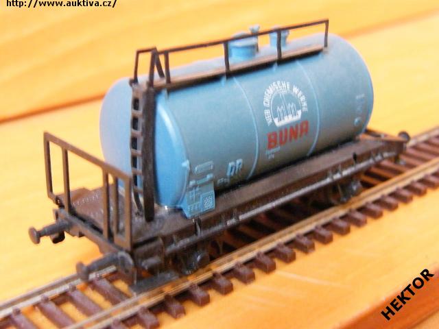 RARITA!!! Sběratelský model 2osé cisterny typu Zw 52, DR, kotel stříkaný modrou, logo a popisy lisované, na kotli uprostřed nahoře tištěno bílou a pod ním červenou nápis BUNA, vysoké kovové zábradlí brzdové lávky, kovový žebřík a horní lávka, spodek vozu černý příhradový lepený, brzdová soustava vkládaná černá. Výrobcem Zeuke koncem 60. let, kat. č. 545/739. Výměnná spřáhla a umělohmotná dvojkolí. Po zakoupení byl model pouze občas ježděn, je dlouho neježděn. Bez originální krabičky.