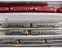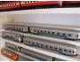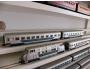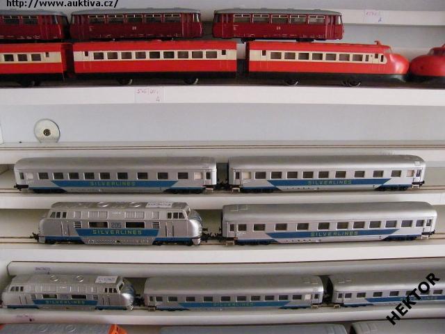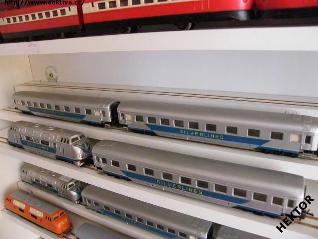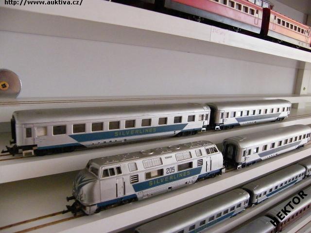 RARITA!!! Set skládající se z 1 dieselové lokomotivy V 200 a 3 rychlíkových vozů od výrobce Zeuke, epocha III. Set se skládá z jedné dieselové lokomotivy typu V 200 stříkané stříbrnou s modrým lichoběžníkem pod okny a žlutým nápisem "SILVERLINES" a 3 stříbrných rychlíkových osobních vozů typu ABű 4eg s modrým lichoběžníkem pod okny a žlutým nápisem "SILVERLINES". Set byl uložen v papírové krabici. Výrobcem Zeuke v letech 1966 - 67, kat. č. 545/76/3a. Lokomotiva a vozy mají pevná spřáhla typu Zeuke černá. Lokomotiva má dvojkolí kovová plná bez bandáže a vozy mají dvojkolí umělohmotná. Po zakoupení byl set ježděn, pak byl odložen do vitríny a pouze několikrát zkušebně projet, je dlouho neježděn. Bez originální krabice.