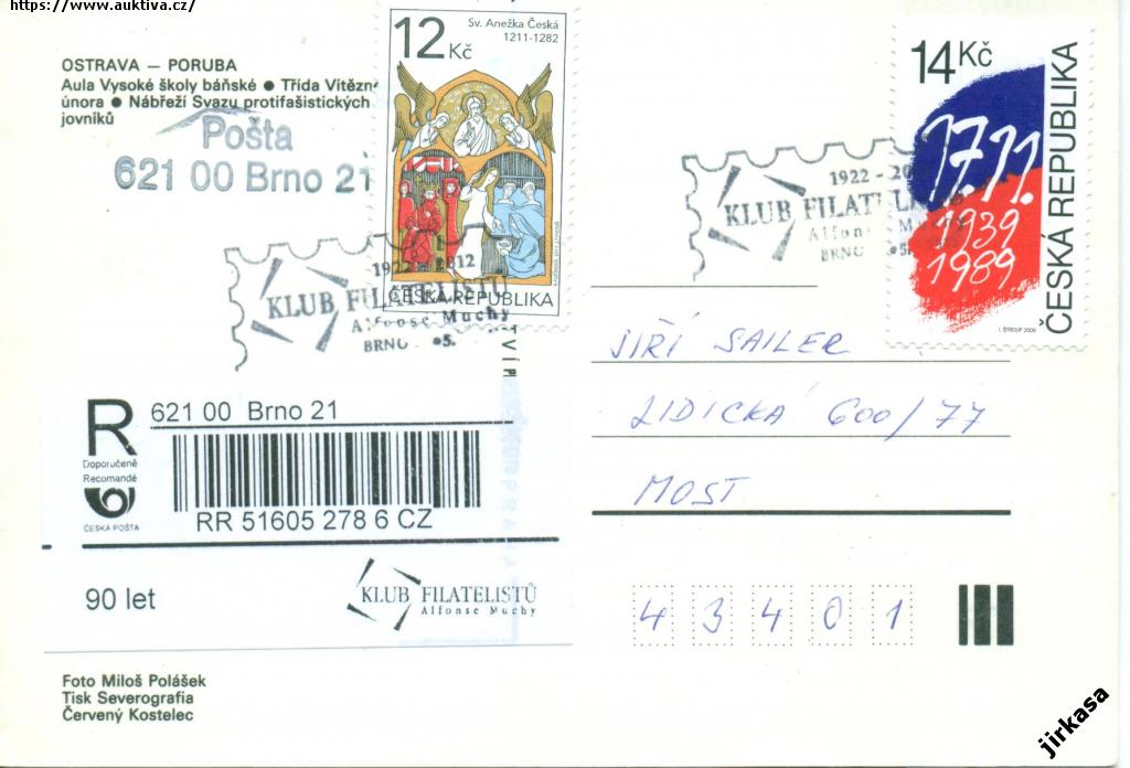 Razítko a R nálepka Brno 90 let KF A. Muchy pohled Ostrava
