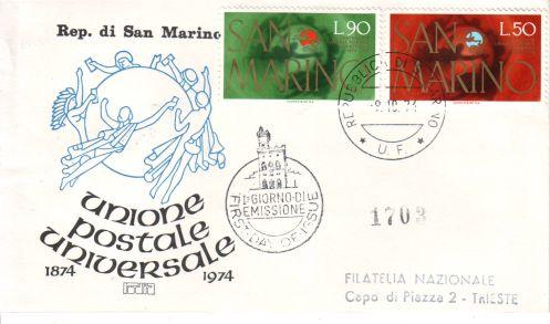 San Marino 1974 100 let světové poštovní unie, Michel č.1075-6 FDC