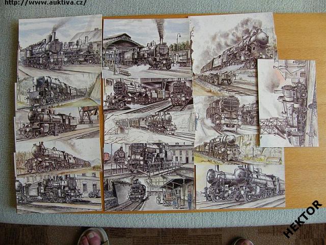 Set 19 kreslených obrázků starých parních loko ČSD *6543