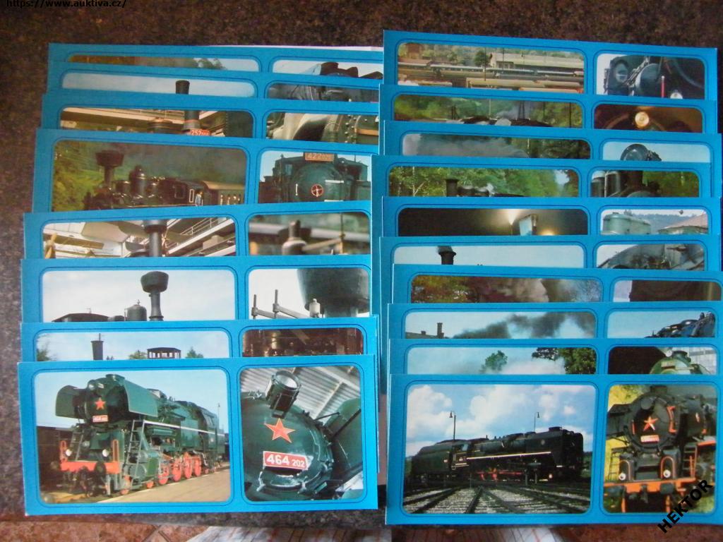 Set 21 barevných obrázků (vč. obalu - 21 + 1) velikosti 240 x 105 mm - starých parních lokomotiv ČSD z dob hluboké totality vč. obalu. Nové nepoužité. Cena je za 1 set.