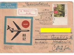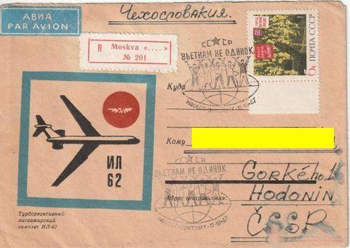 SSSR 1967 Ilustrovaná obálka Letadlo Il62, zn.Michel č.3293 Vietnam zvítězí 1966, Příležitostné razítko Moskva Vietnam není sám! Odesláno doporučeně z Moskvy do Hodonína ...