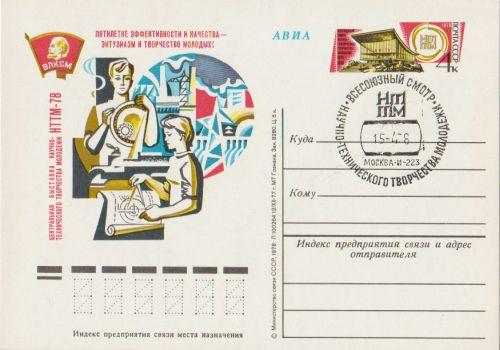 SSSR 1978 Výstava efektivnosti a kvality práce mládeže, příležitostná dopisnice s originální známkou 771212 PR Moskva