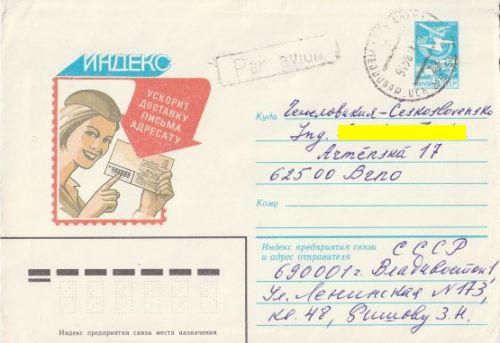 SSSR 1983 Celinová obálka 830421 Index (PSČ) urychlí doručení dopisu adresátovi raz.Vladivostok - do Brna.