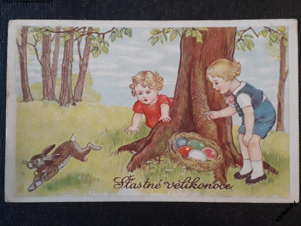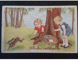 Šťastné velikonoce - děvčata u stromu, kraslice, zajíc, les