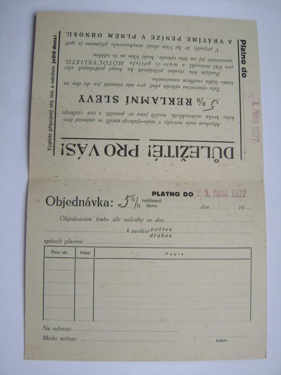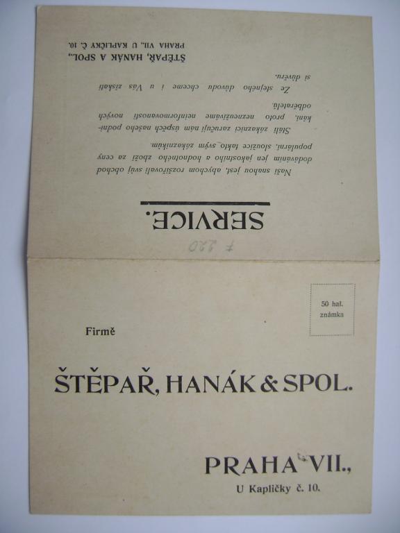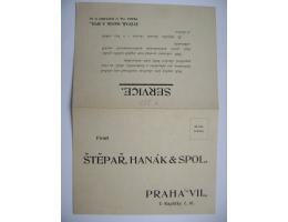 Štěpař, Hanák & spol. Praha, motocykly Ariel 1927 odp.lístek