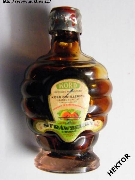 STRAWBERRY LIQUERE – lahvička asi 50 ml, originálně uzavřené, ale uvolněný krycí uzávěr. Časem se část obsahu vypařila. Vyrobeno ve firmě KORD Hradec Králové. Z dob hluboké totality. Cena je za 1 kus.