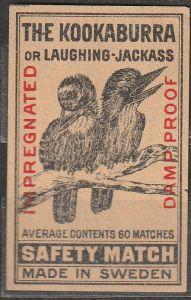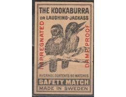 Švédsko Zápalková 1930 nálepka The Kookaburra 2 ptáci 36x56m