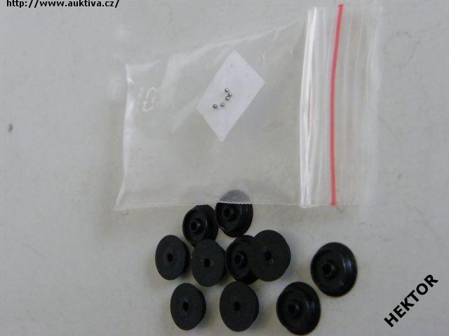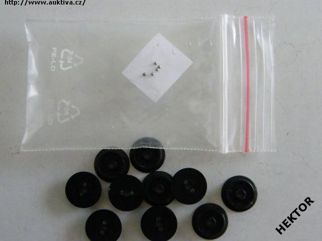 Umělohmotná kolečka - TT - 10 kusů + 5 malých kovových kuliček do ložisek lokomotiv. Nové nepoužité. Cena je za 1 balíček.