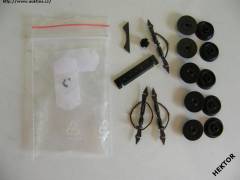 Umělohmotná kolečka - TT - 10 kusů + 5 malých kovových kuliček do ložisek lokomotiv + 3 různá pevná spřáhla + 3 různé díly TT. Nové nepoužité. Cena je za 1 balíček.