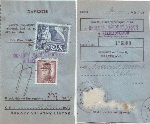 Ústřižek poštovní poukázky na Okresní národní výbor v Želiezovciach 1948, zajímavé použití poštovních známek k úhradě poplatku za poštovní poukázku i poukazovanou částku, pošta Málaš