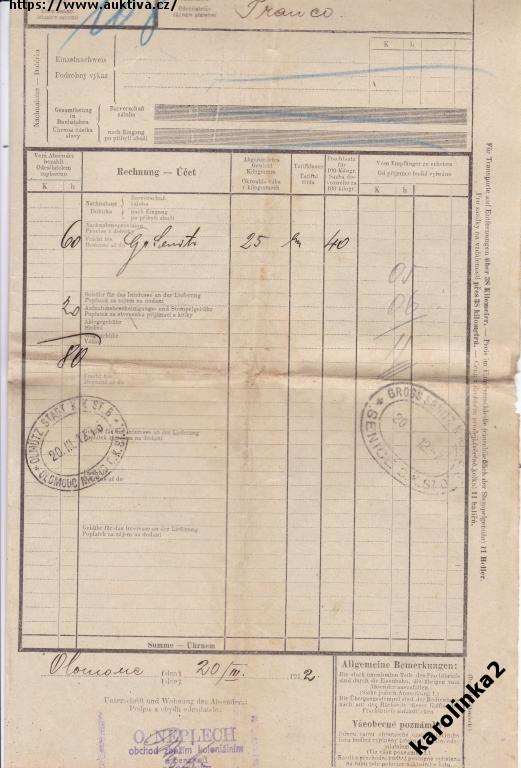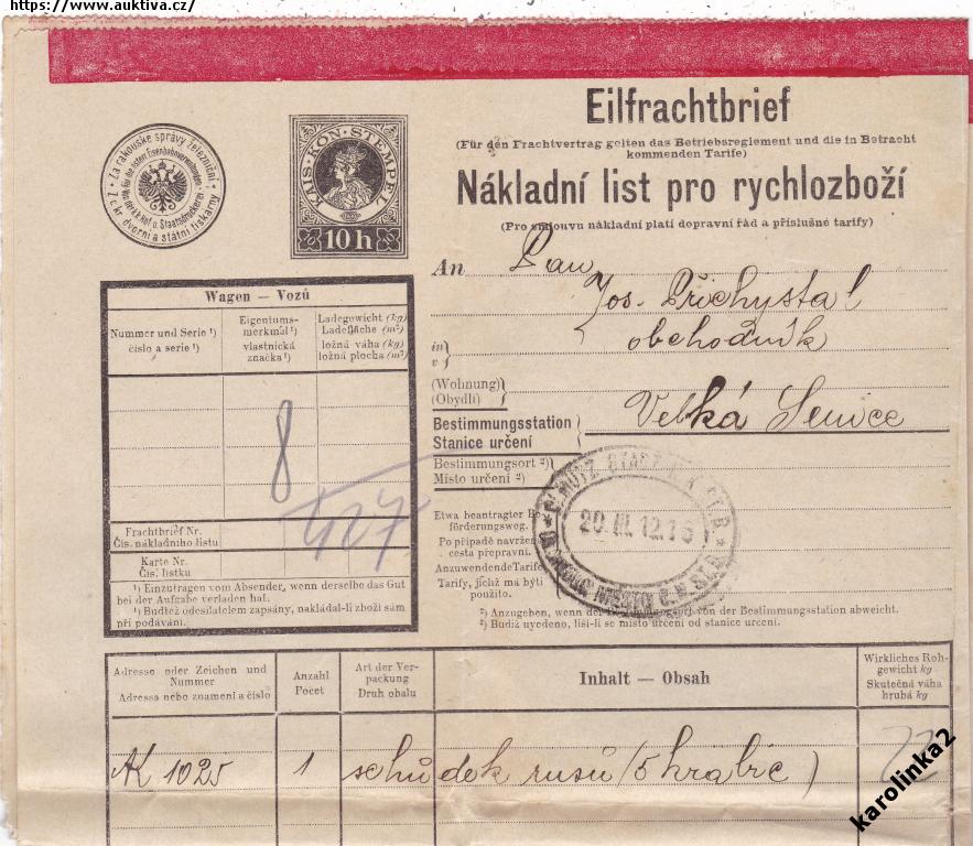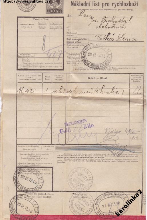 VELKÁ SENICE+OLOMOUC=NÁKLADNÍ LIST +KOLEK=rok1912=c13255