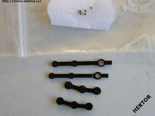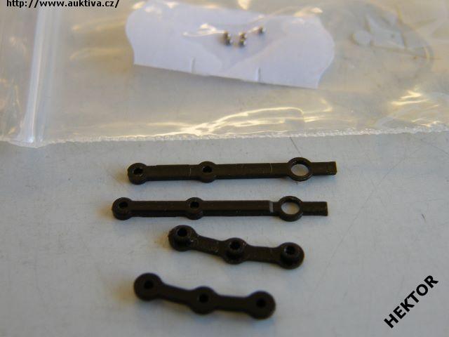 Výlisek umělohmotných spojnic parních lokomotiv - 2 kusy dlouhé rovné + 2 kusy krátké zalomené + 5 kovových kuliček do ložisek lokomotiv - TT. Výrobcem TILLIG. Nový nepoužitý. Cena je za 1 kus.