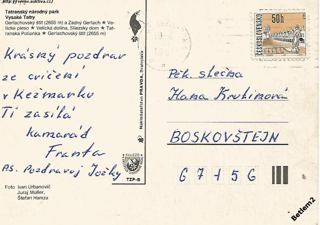 Při jedné i více vyhraných aukcích jednou poštovné 38 Kč za doporučenou zásilku (platí asi pro 1-9 ks pohlednic, dále dle váhy a ceny)Do ceny 500 Kč doporučeným dopisem, nad 500 Kč cenným psaním. Obyčejným dopisem vzhledem ke "ztrátám" zasilek jen na výslovné přání a riziko kupujícího.