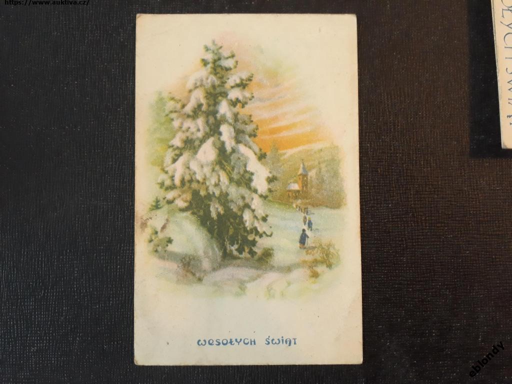Wesołych Świąt - strom a kostel, sníh - polská pohlednice