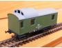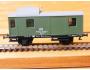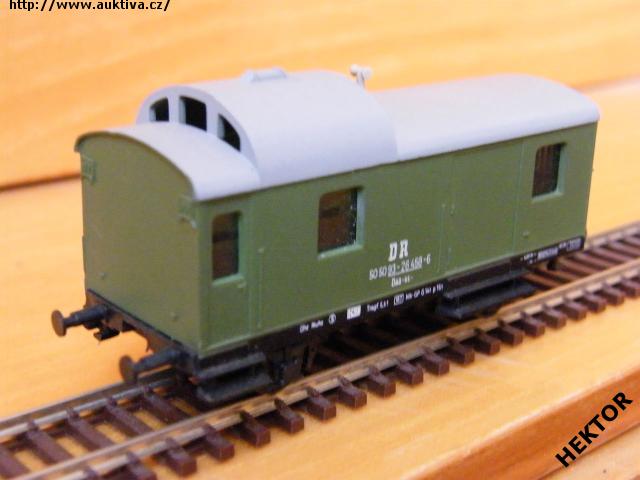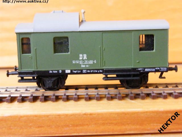 Sběratelský model 2osého služebního vozu s jednou nástupní plošinou typu Pwg, DR, epocha IV, karosérie stříkaná zelenou a rám černou, logo DR tištěno bílou uprostřed pod okny na zeleném podkladu, číslo vozu 50 50 93 - 26 458 - 6 a popisy tištěny bílou uprostřed pod okny na zeleném podkladu a na černém rámu, bez směrové cedule, střecha s nezasklenou nástavbou je součástí karosérie stříkaná světlejší šedou s anténkou, rámy oken nahoře kulatý, v oknech plochý plast s naznačenými černými mřížemi, okna ve vstupních dveřích zasklená, spodek vozu umělohmotný černý lepený, brzdová soustava součástí spodku vozu. Výrobcem BTTB v 80. letech, kat. č. 03420. Výměnná spřáhla (dodám) typu BTTB černá a umělohmotná dvojkolí. Po zakoupení byl model odložen do vitrýny a pouze několikrát projet, je dlouho neježděn. Bez originální krabičky.